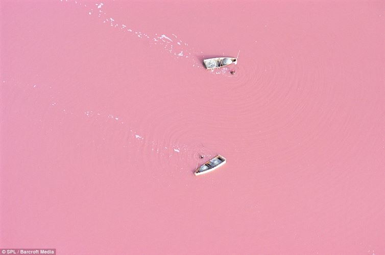 This is not an advertisement for Pepto Bismol. It is Lake Retba in Senegal, and is actually very pink. This is because the high salt concentration in the water (up to 40%) creates a buildup of Dunaliella salina, a salt-loving bacteria. Salt is harvested from this lake and used or sold by the locals.